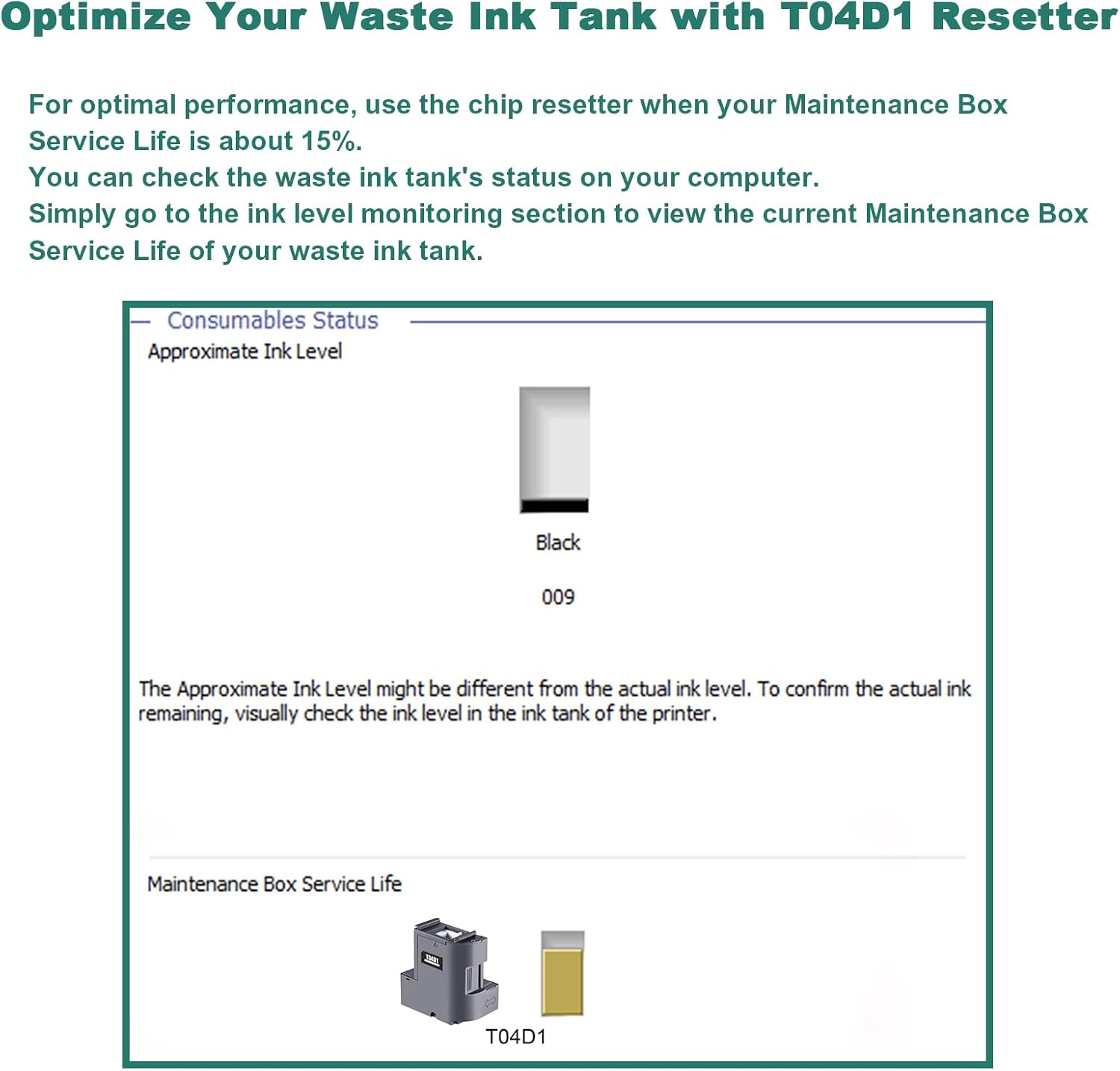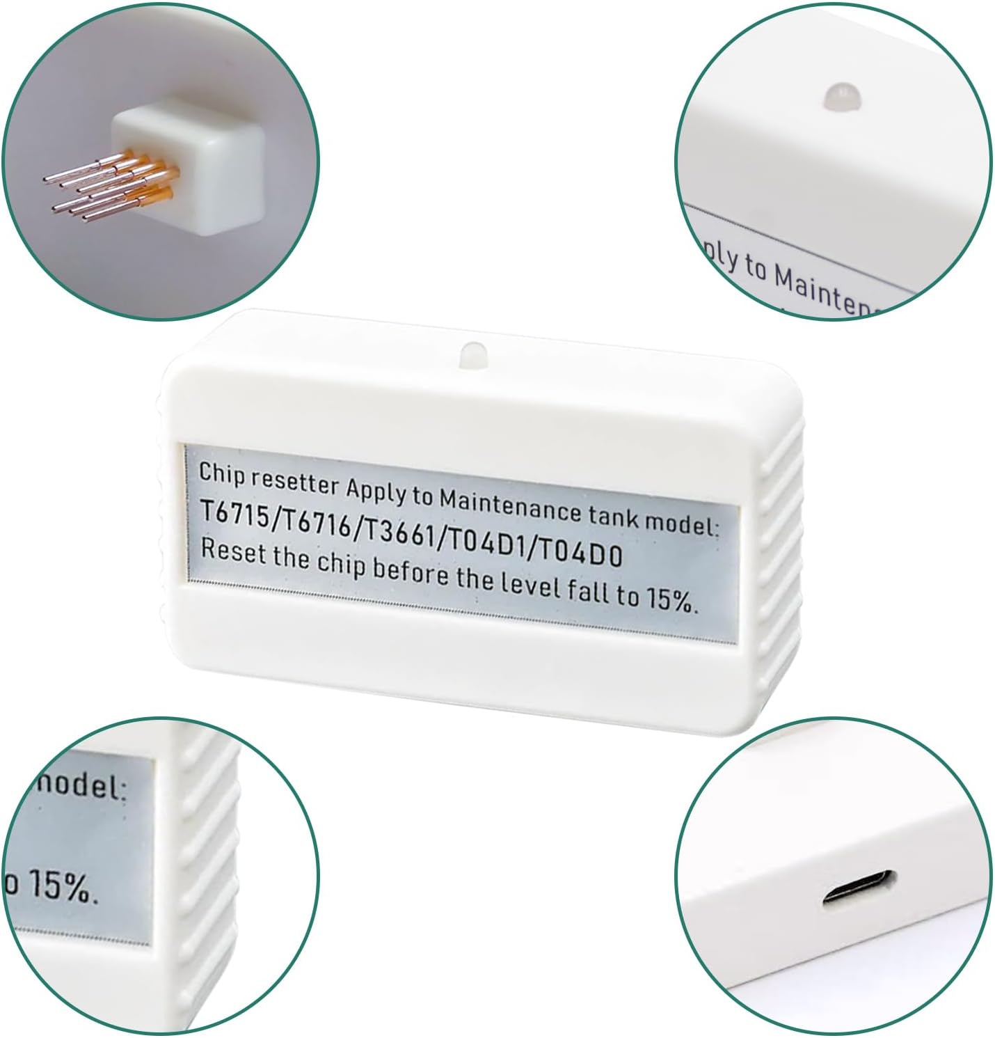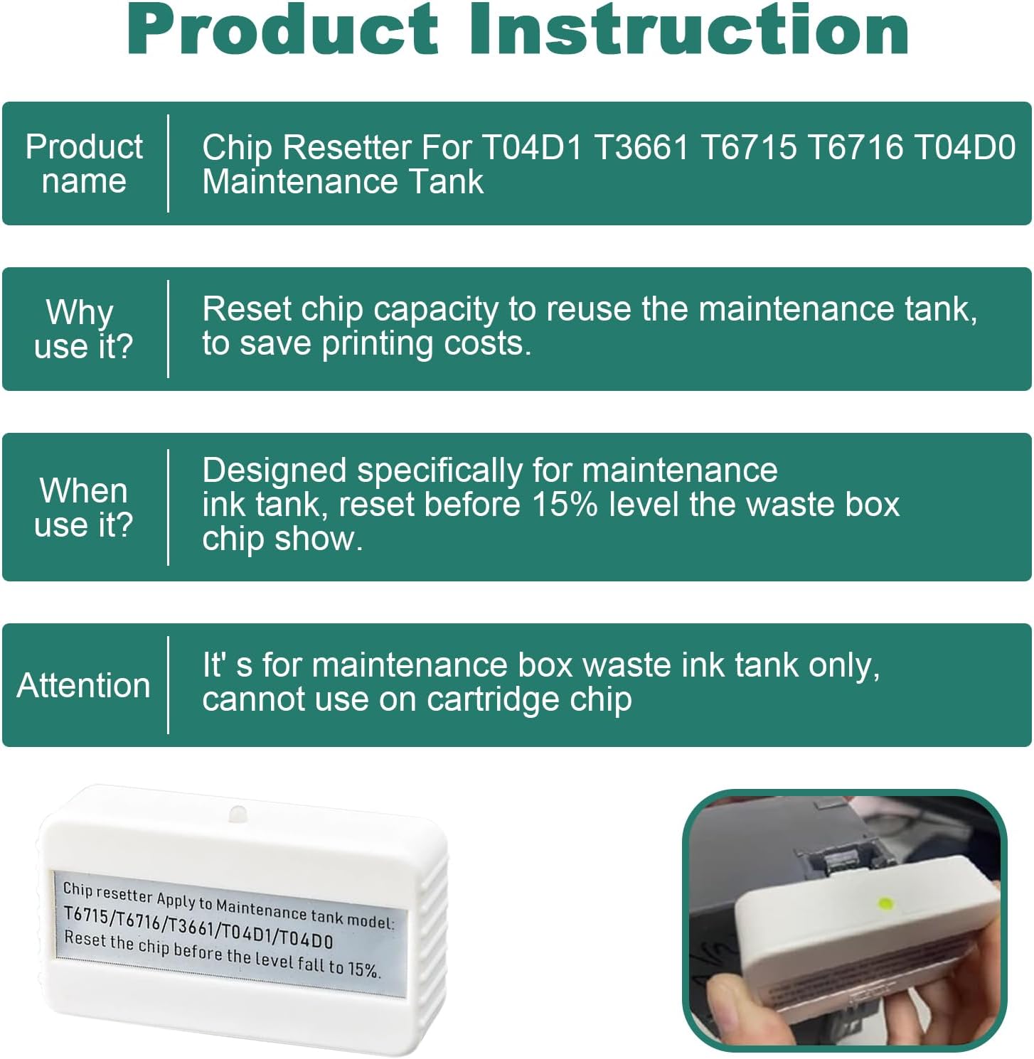 Lorsque la maintenance box est détectée comme pleine, l’imprimante bloque automatiquement l’impression. Grâce à ce chip resetter, vous pouvez réinitialiser la puce électronique de la boîte de maintenance et restaurer immédiatement le fonctionnement normal de votre imprimante.